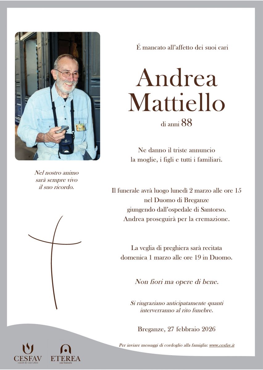 Lascia gratuitamente un messaggio di cordoglio, sarà nostra cura consegnarlo ai congiunti di Andrea Mattiello.