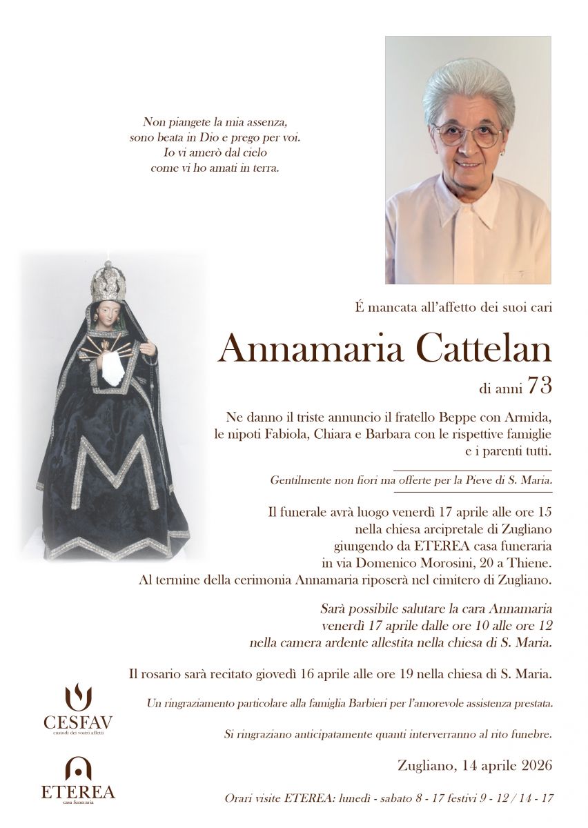 Al termine della cerimonia Annamaria riposerà nel cimitero di Zugliano.
